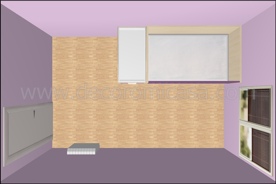 En la siguiente imagen vemos la imagen de la habitación vacía y podemos ver con más claridad la ubicación de la puerta, ventana y radiador. Vamos a hablar de pared principal refiriéndonos a la pared más larga sin elementos distorsionadores (puertas, ventanas, radiadores,...) En este caso será la pared superior (la de enfrente del radiador).