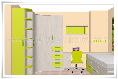 En esta ocasión os vamos a presentar el diseño en 3D de una habitación juvenil para dos niños en una planta rectangular con columna y pasillo en la entrada. Se trata de realizar una composición donde puedan dos niños o niñas y de aprovechar al máximo la capacidad de almacenaje de ropas y trastos